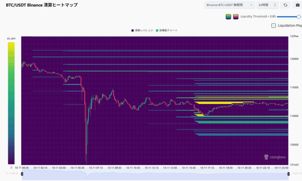 で、重要なのは、今後どうなるのかだと思うので、自分なりに考えてみた。まずは清算ヒートマップをみたら、まあ