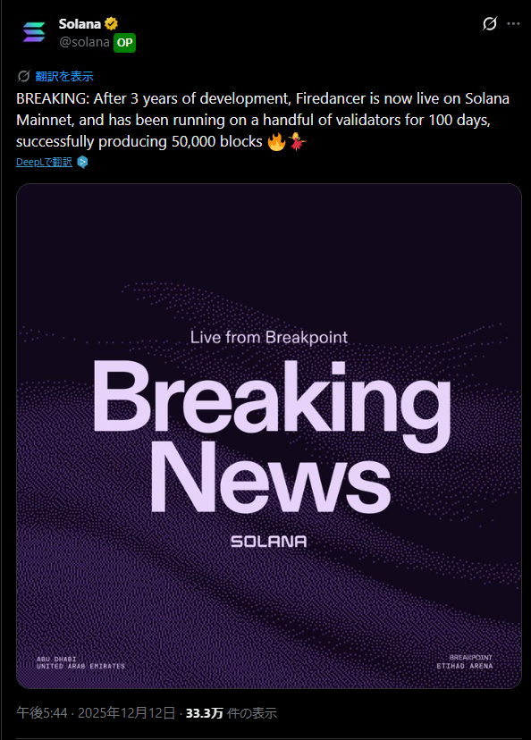 みたいと思う。ついに、ソラナのメインネットにFiredancerが実装されたようだ。それも、タイミングを合わせたか