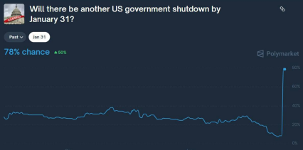 今月末に予算が通らなければ、アメリカ議会がまた閉鎖される。Polymarketではその議会閉鎖リスクの予想が急激に