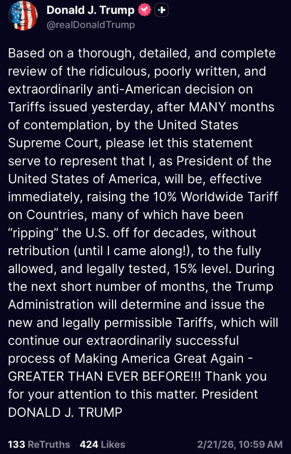 たった今、トランプが世界全体にかける新たな関税率を10%から15%へ引き上げをツイッターで発表した。