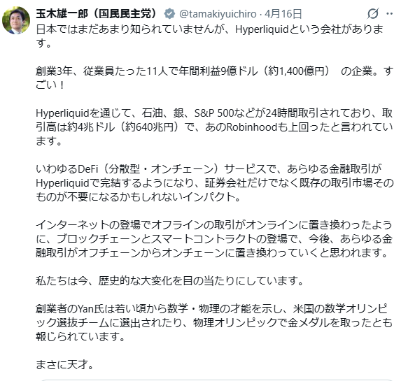 今、話題になっているハイリキとCEOなんだが、国民民主の玉木も絶賛している。ハイリキに対するビジョンやNoVC